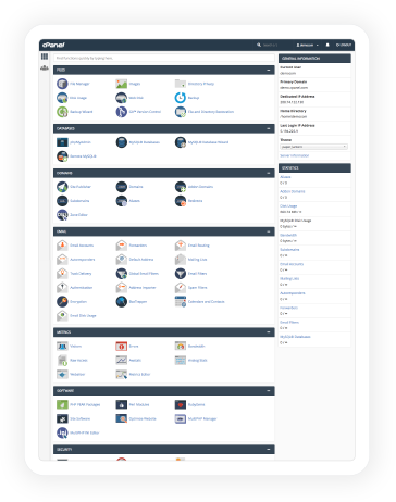 cPanel is a graphical web-based control panel that helps you quickly and easily manage your website and hosting account. cPanel software gives you complete control over a vast amount of functions, streamlining useful processes such as: